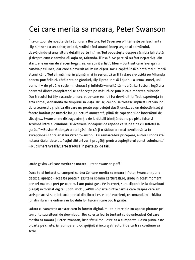 Cartea cei care merita sa moara peter swanson in format pdf într un zbor de noapte de la londra la boston ted severson o întâlnește pe fascinanta lily kintner. La un pahar cei doi străini până atunci încep un joc al adevărului dezvăluindu și unul altuia detalii foarte intime. Transport gratuit 75 lei si livrare rapida. Tot ce nu ți am spus care a ocupat poziția 6 în topul celor mai interesante cărți citite în 2016 maestra și privilegiații și pot spune acum după oareșce experiență că volumele ce alcătuiesc colecția îți prind.
