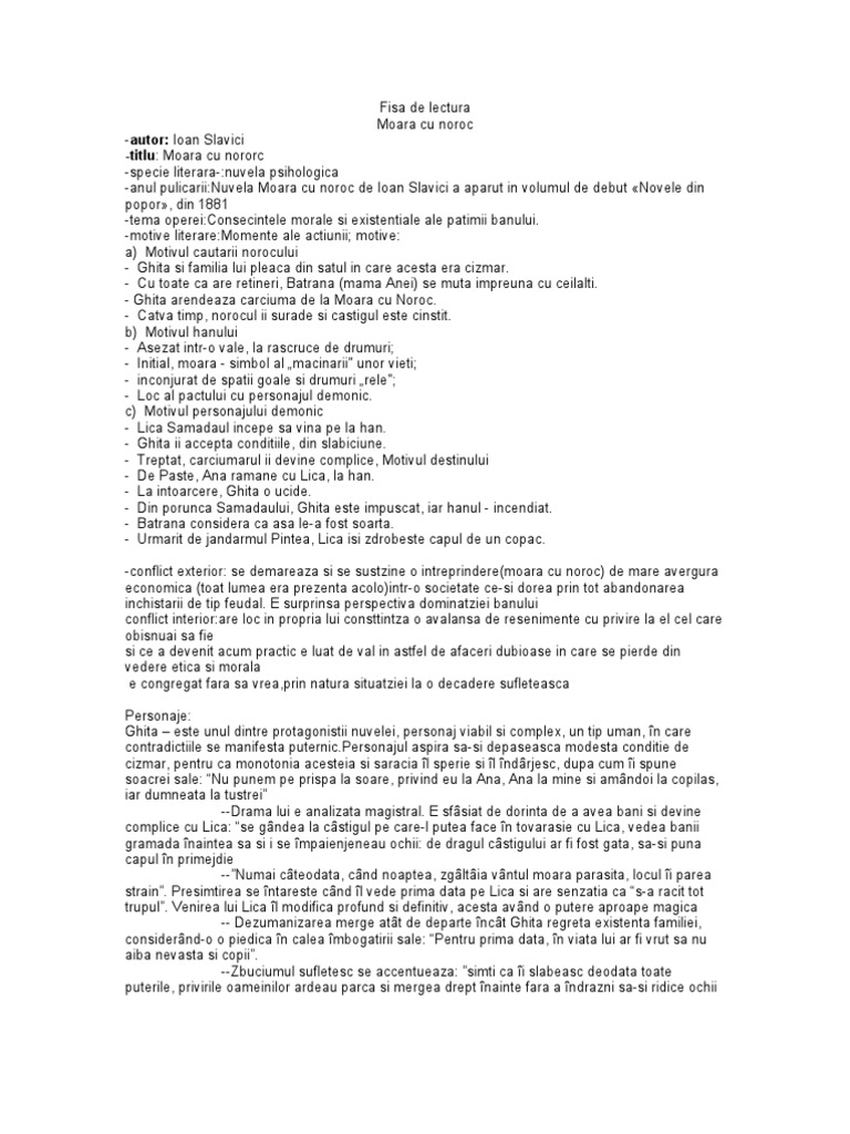 Fisa de lectura moara cu noroc. Proza locul desfurrii aciunii. Romana 303 afisari 121 descarcari fisa de lectura moara cu noroc ioan slavici clasa a x a a 1 date despre autor ioan slavici se naste la 18 ianuarie 1848 la siria lînga arad. Moara cu noroc fisa operei. Hanul moara cu noroc campia aradului timpul desfurrii aciunii.