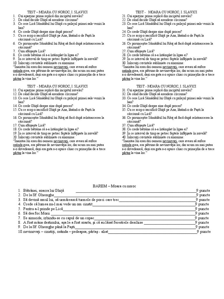 Moara cu noroc capodopera a literaturii noastre nuvelistice a fost publicata in volumul de debut novele din popor aparut la bucuresti in 1881 volum apreciat de mihai eminescu pentru adancimea sufleteasca a lumii evocate de autor si de catre titu maiorescu ca un moment de referinta al vietii literare romanesti parasind oarba imitare a conceptiilor straine sau inspirat din viata. Fisa de lucru pentru moara cu noroc de ioan slavici. 1 date despre autor. Moara cu noroc de ioan slavici bacalaureat 2009.