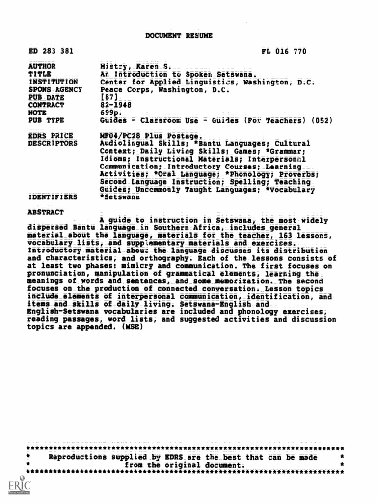 A Guide To Spoken Setswana Vocabulary Linguistics