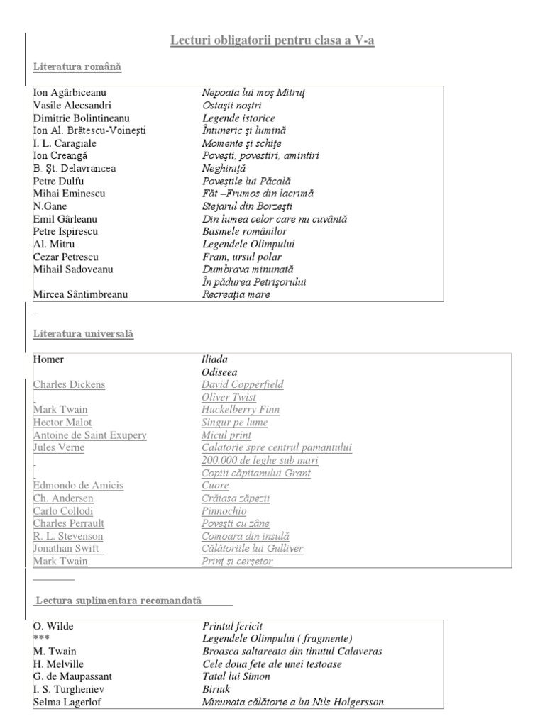 Listă Lecturi Obligatorii Clasa A V A Machete Didactice