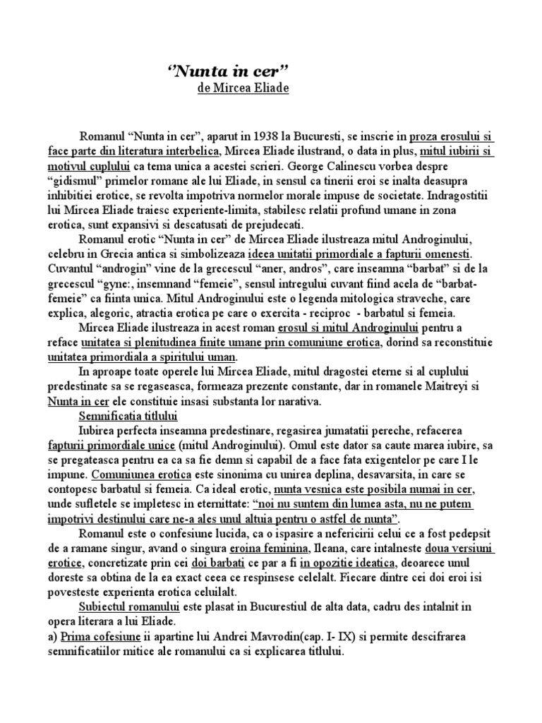 Recenzie La Romanul Nuntă In Cer De Mircea Eliade Diez