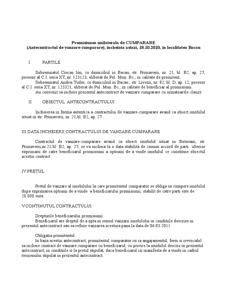 Model De Promisiune Unilaterală De Vanzare Docx