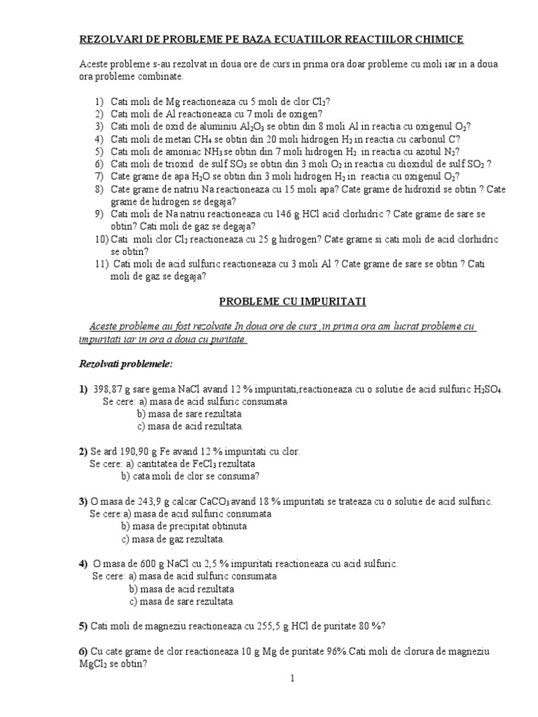 Probleme Care Se Rezolva Pe Baza Ecuatiilor Reactiilor Chimice Clasa A Viii A