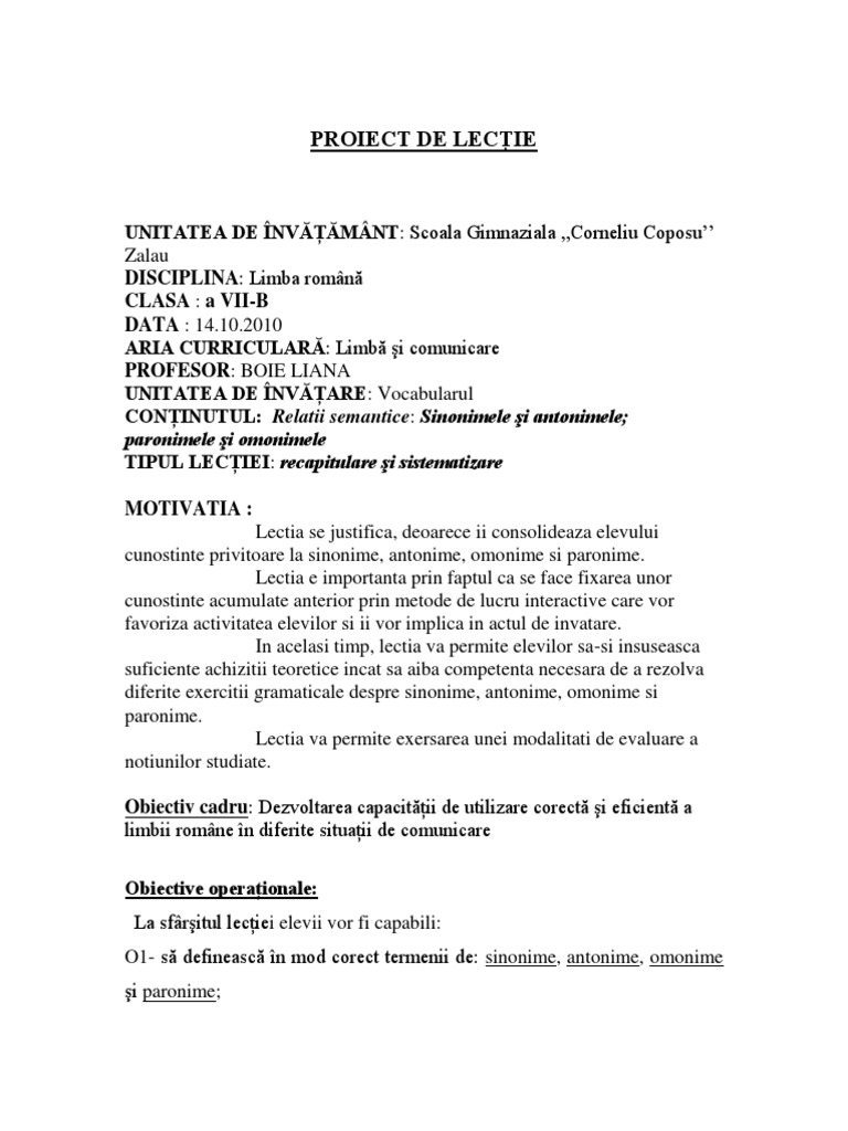 Proiect Didactic Sinonime Antonime Omonime Paronime