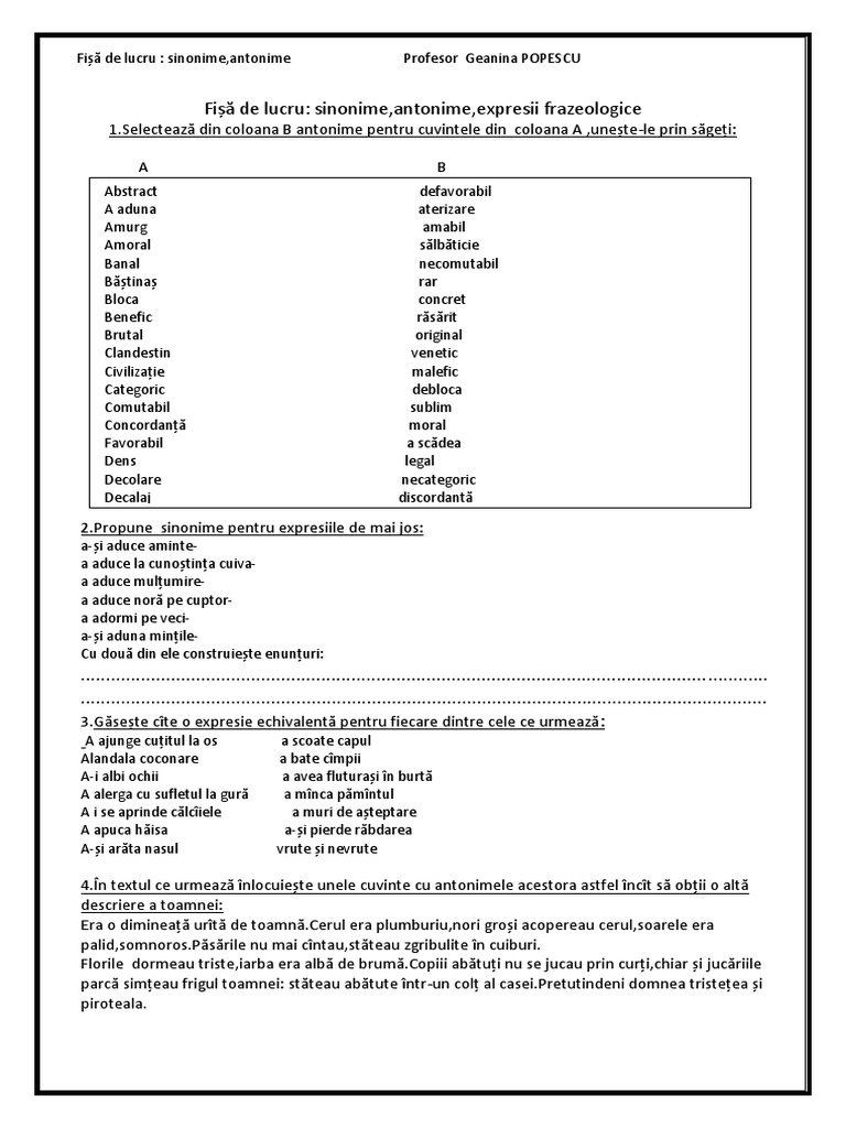 Fisa De Lucru Sinonimele Si Antonimele
