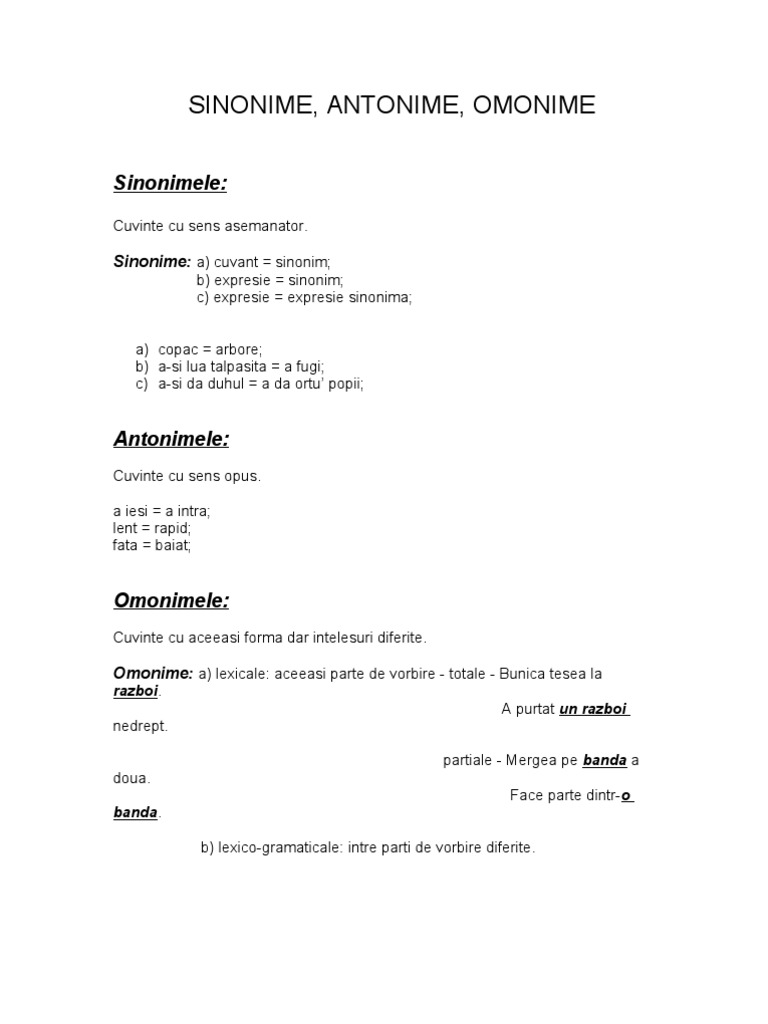 Sinonime Antonime Omonime Paronime Exercitii