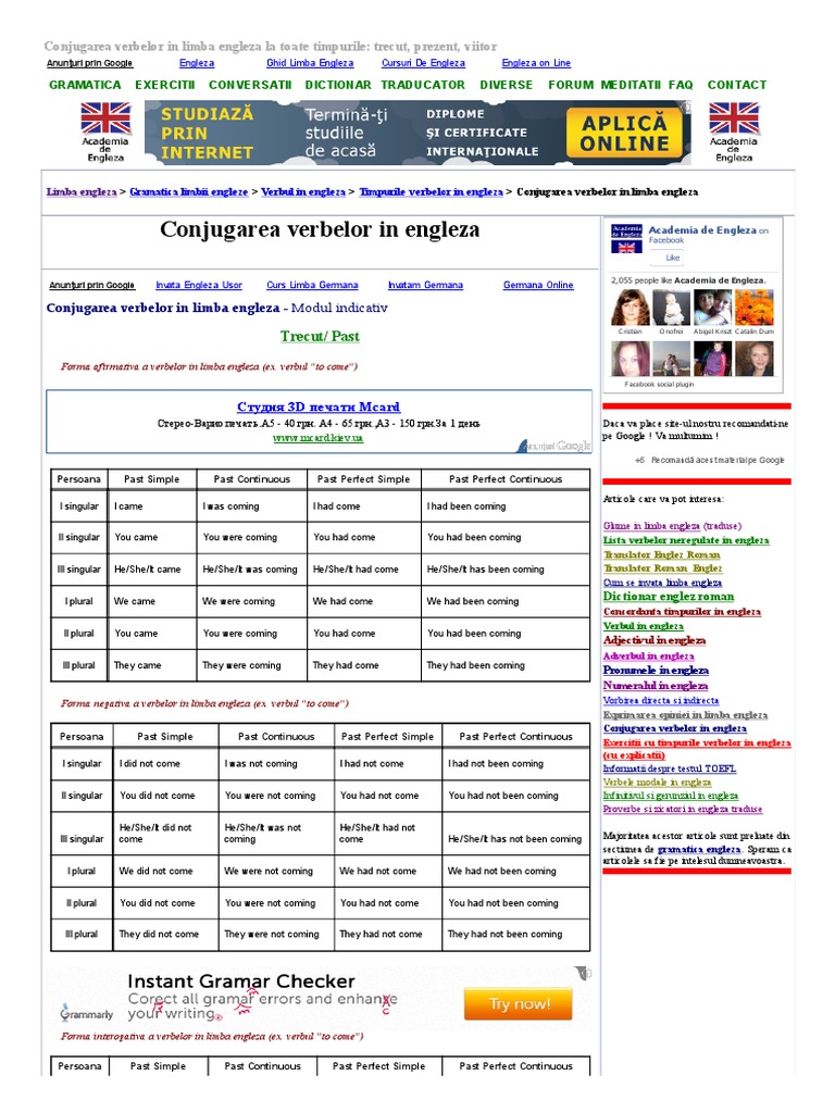 Capitolul 8 Lista Principalelor Verbe Neregulate Si Conjugarea Lor